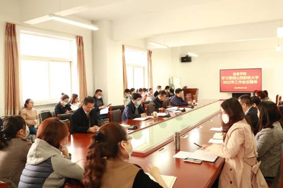 党委在学院会议室召开会议,学习贯彻学校2022年工作会议精神,学院党政领导班子、全体教职工参加。