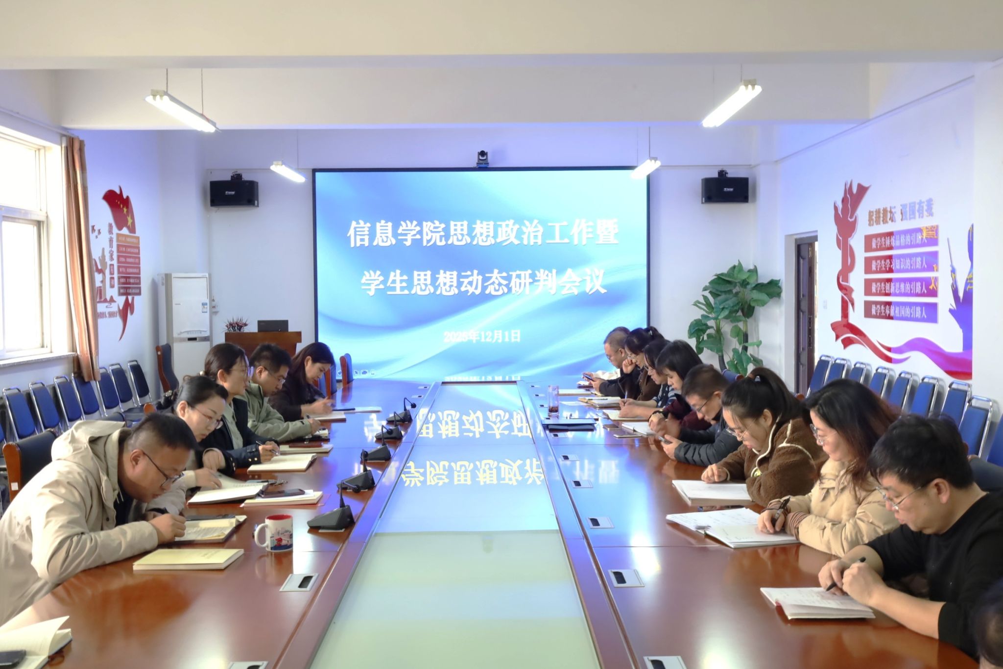在会议室召开思想政治工作暨学生思想动态研判专题会议。学院领导班子全体成员、全体行政人员及全体辅导员参加会议。会议由学院党委书记高萍主持。