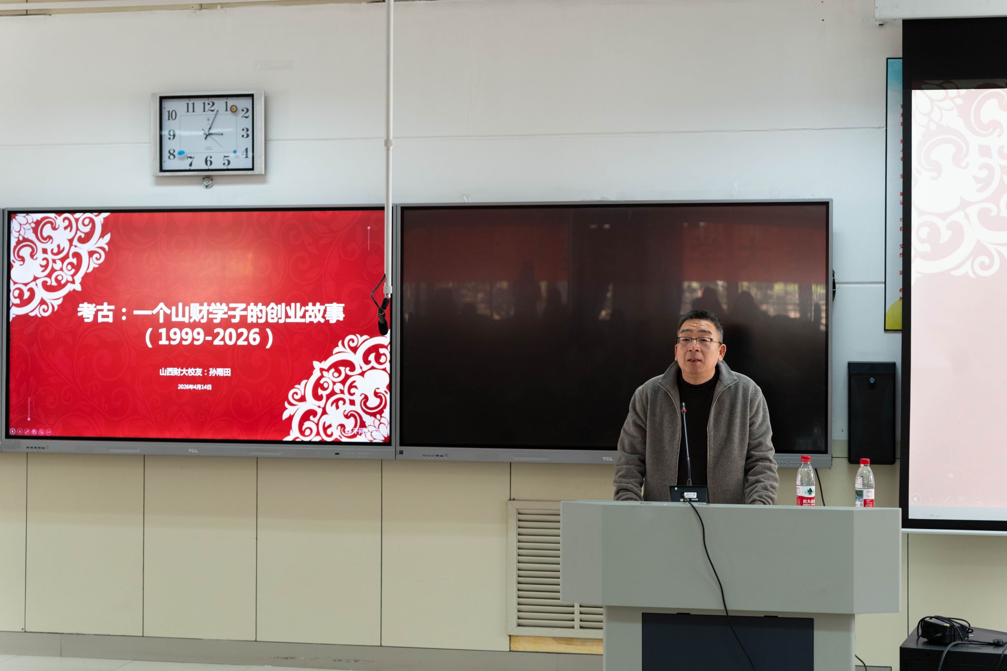 1999届经济信息管理专业优秀校友、国内最大旧书交易平台——孔夫子旧书网创办人孙雨田作了“考古:一个山财学子的创业故事(1999-2026)”的报告。活动由69书吧
