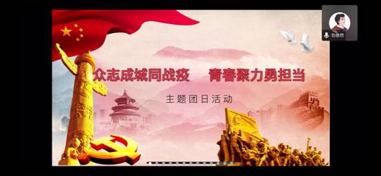 于2020年4月14日在学院各团支部中发起"众志成城共战'疫' 青春聚力勇担当"线上主题团日活动,号召团员青年不断强化责任担当。各团支部精心策划,带领广大团员分析疫情实况、分享防疫心得,认真思考"疫情背后的中国力量与民族精神",讨论"疫情中新时代青年的理想信念和使命担当"。